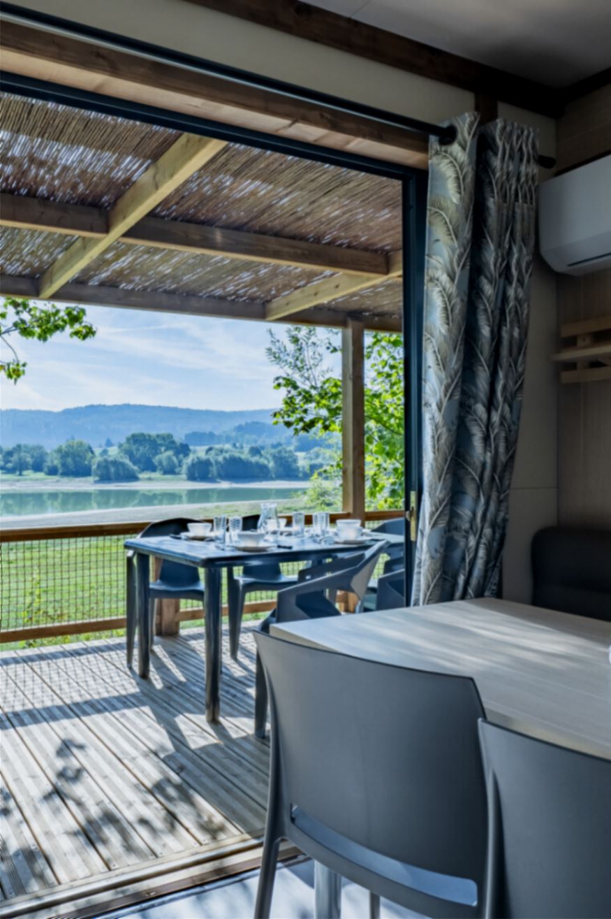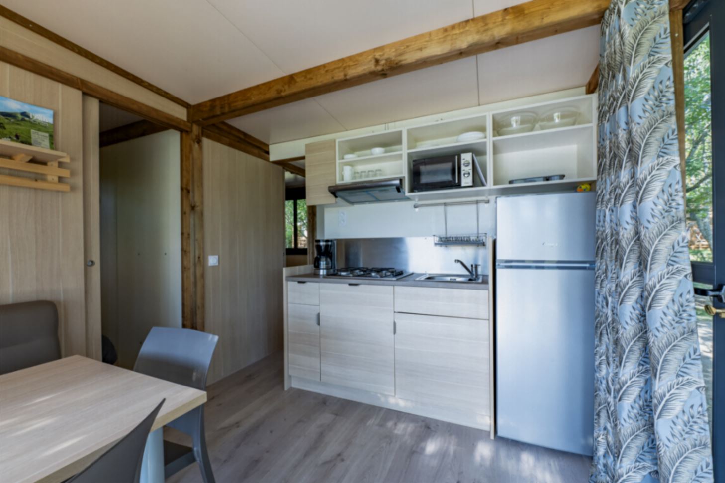 Coin salon/séjour : cuisine équipée (évier, feux gaz, réfrigérateur/congélateur, cafetière à filtre, micro-ondes, vaisselle, lave-vaisselle) et climatisation réversible.