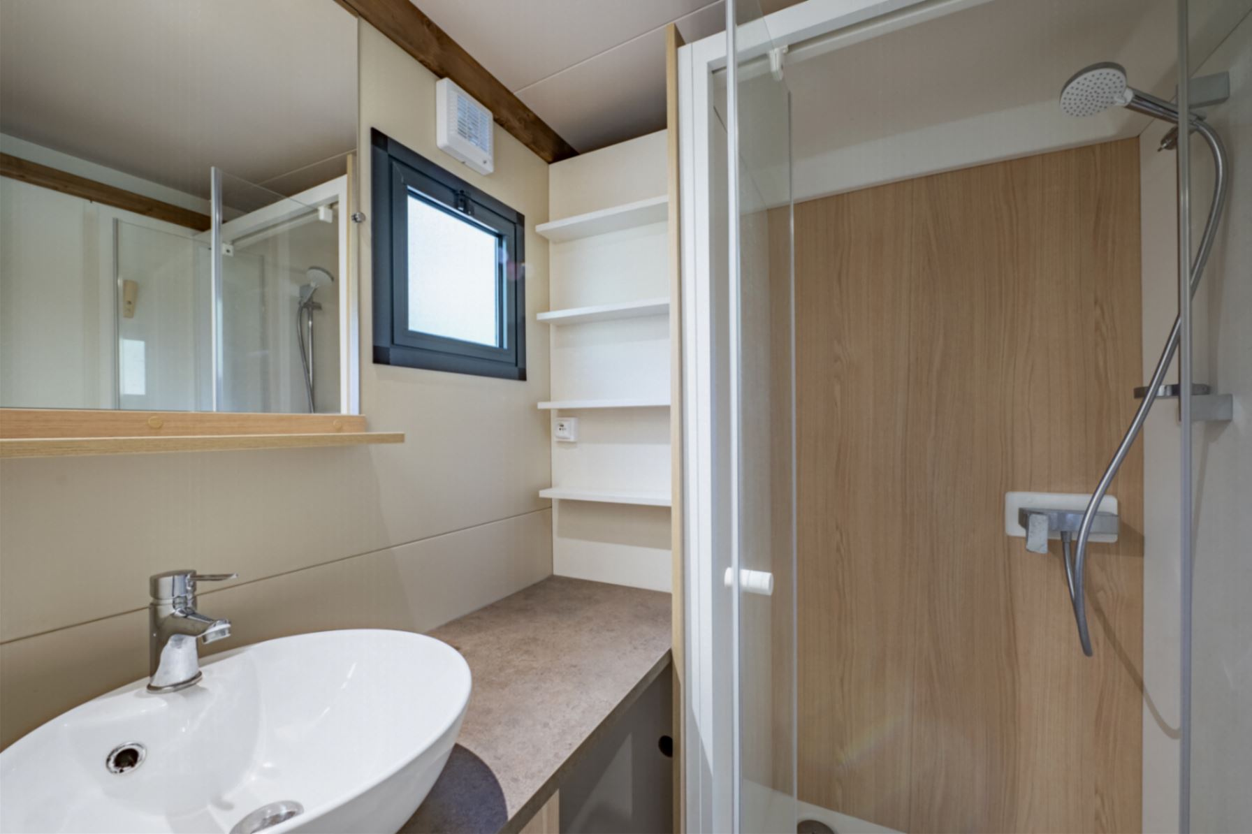 Sanitaire : salle d’eau avec douche, lavabo, WC séparés et sèche serviette.