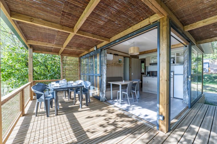 Extérieur : terrasse semi-couverte avec salon de jardin.