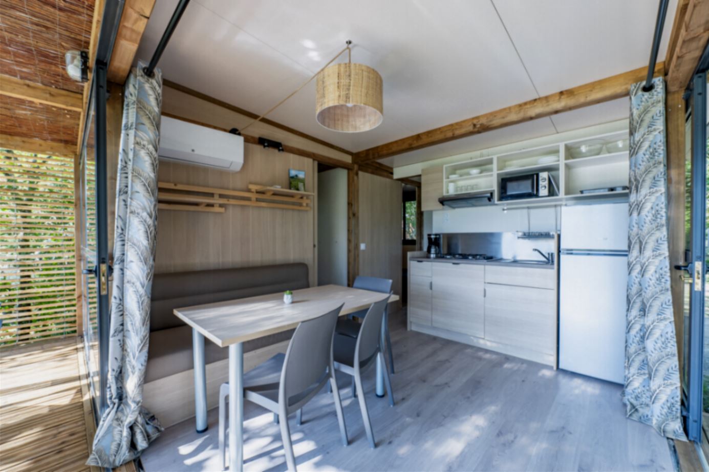 Coin salon/séjour : cuisine équipée (évier, feux gaz, réfrigérateur/congélateur, cafetière à filtre, micro-ondes, vaisselle, lave-vaisselle) et climatisation réversible.