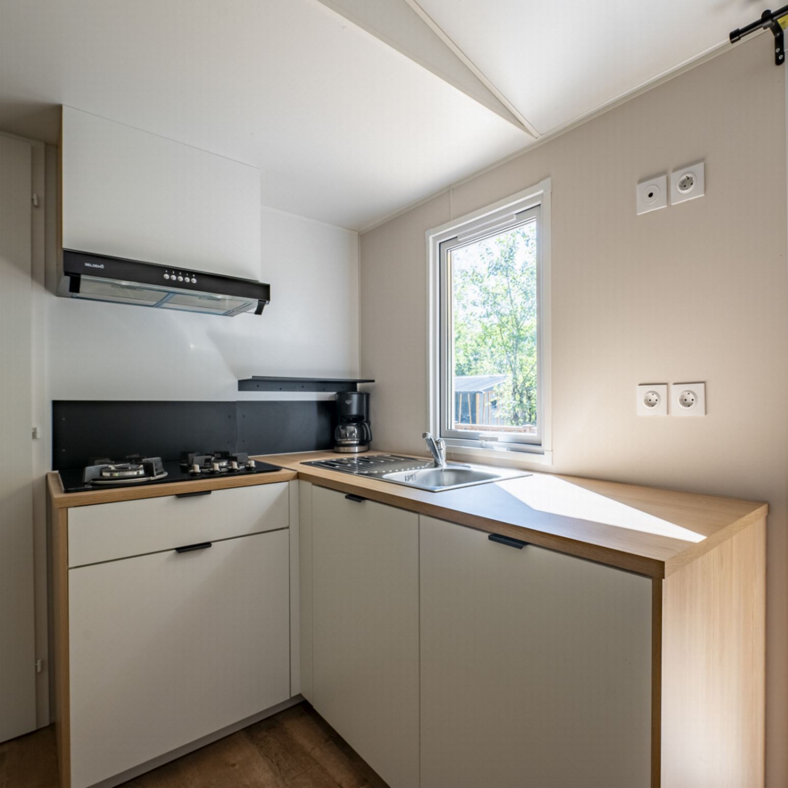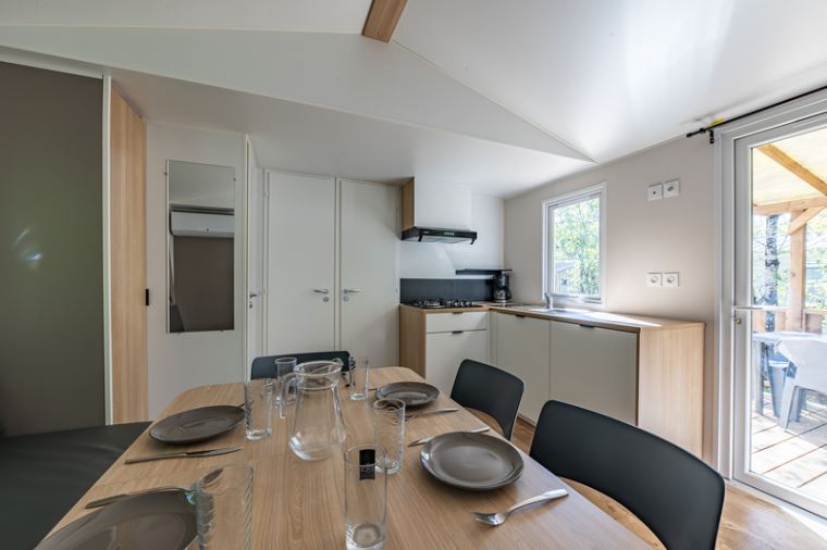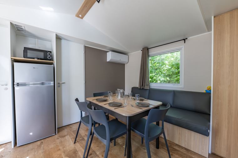 Coin salon/séjour : cuisine équipée (évier, feux gaz, réfrigérateur/congélateur, cafetière à filtre, micro-ondes, vaisselle), climatisation réversible et chauffage dans le séjour.