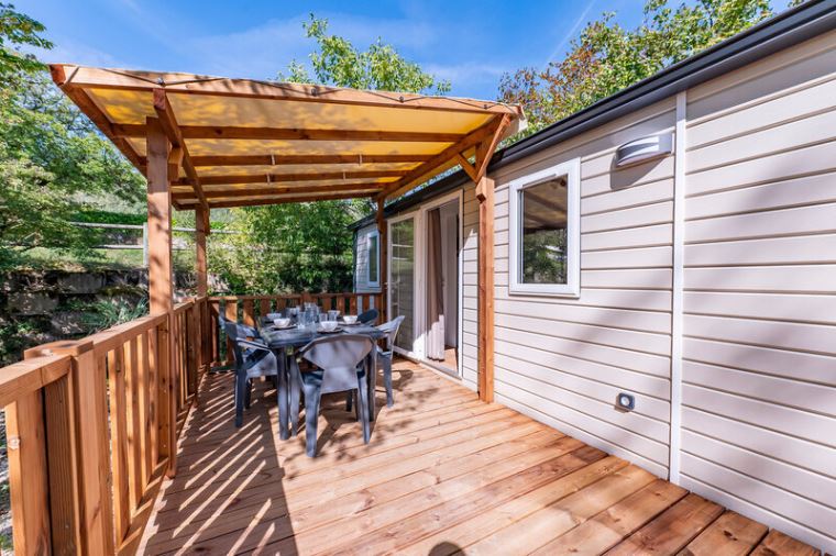 Extérieur : terrasse semi-couverte avec salon de jardin.