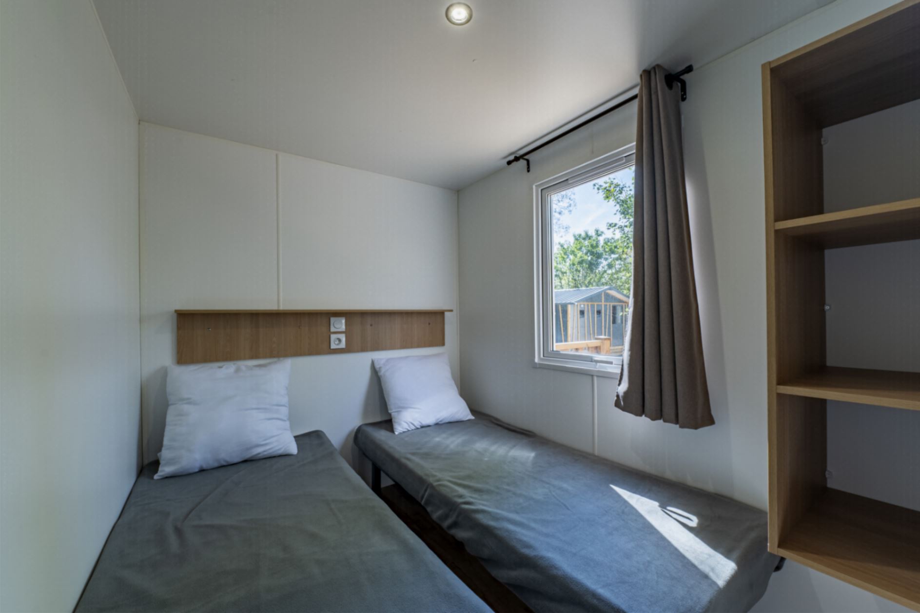 Coin nuit : une chambre avec 1 lit double (140×190), deux chambres avec 2 lits simples (80×190) côte à côte, oreillers et couvertures fournis.